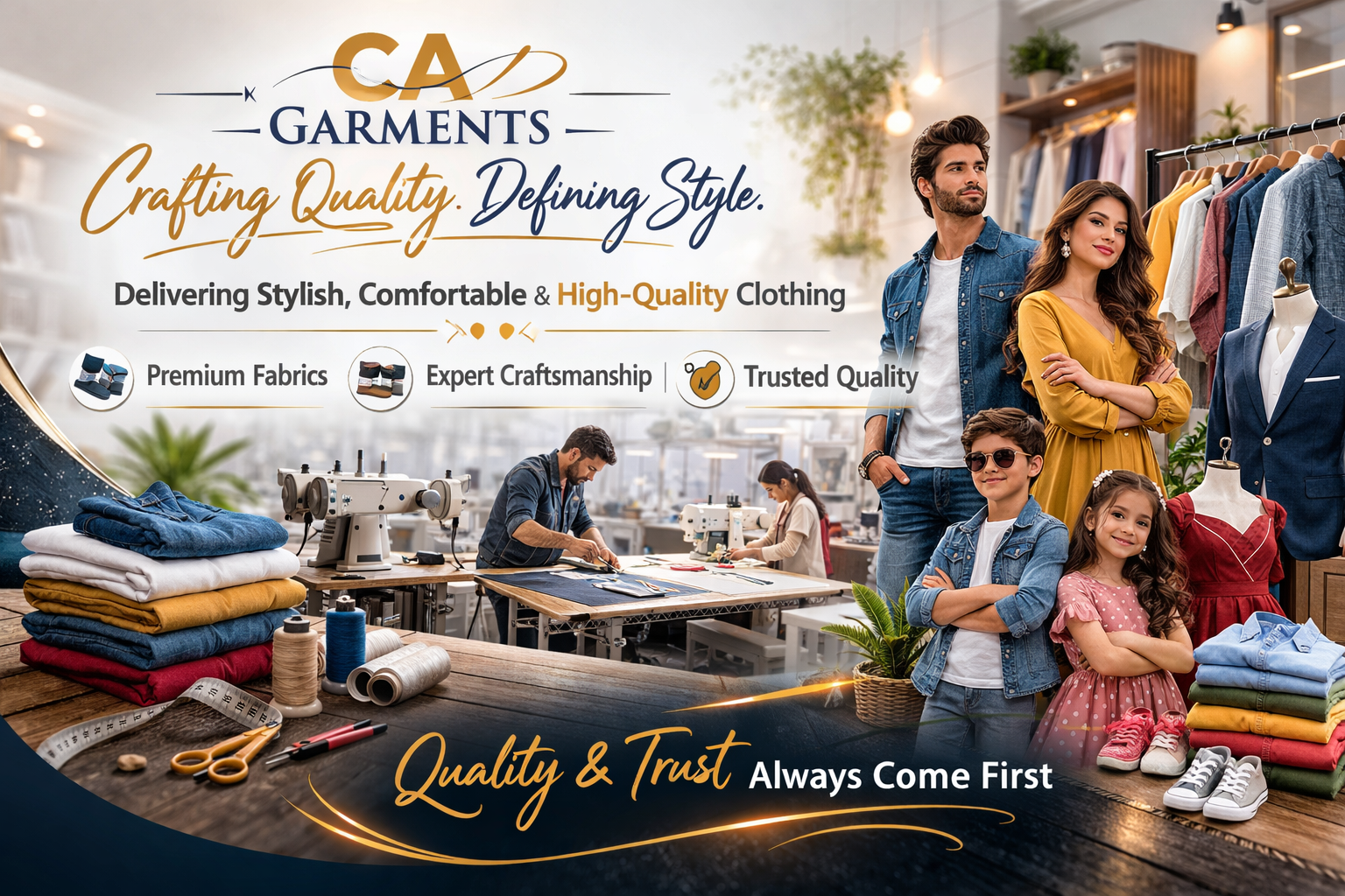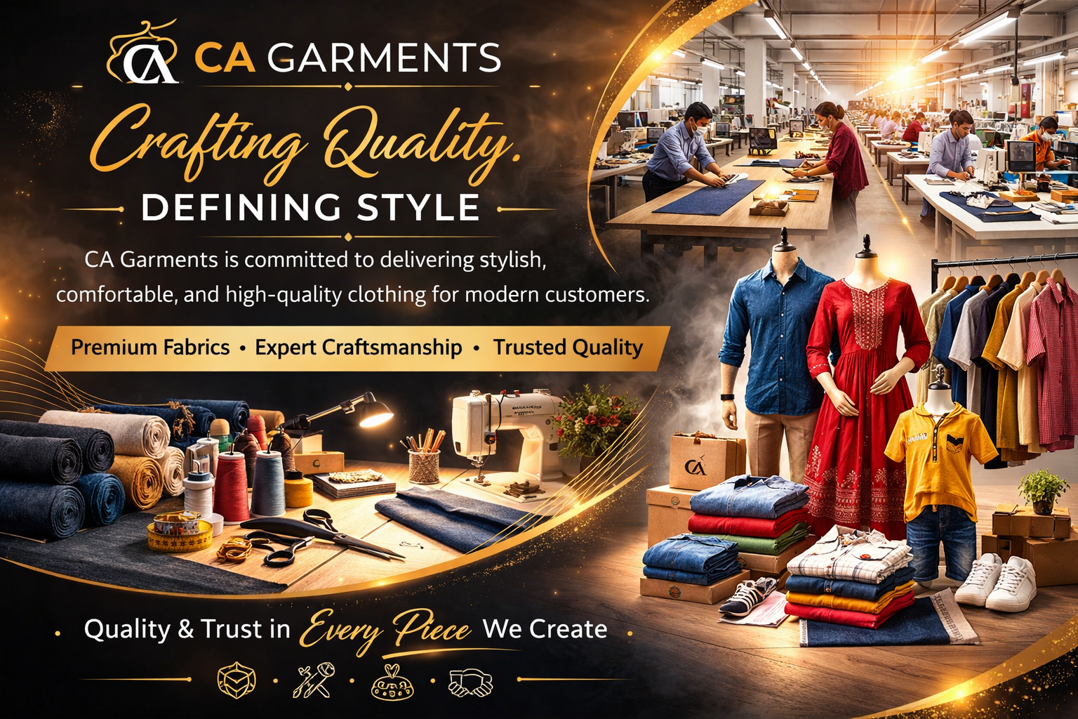 At C A Garments, we specialize in manufacturing, cutting, and selling high-quality garments for men, women, and kids. With a strong focus on precision and craftsmanship, we ensure every piece is made with care, comfort, and durability in mind.
